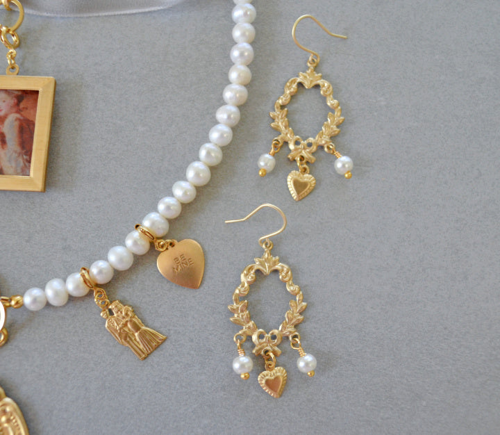 Handmade chandelier earrings made with freshwater pearls, vintage solid brass findings, and gold plated earring hooks