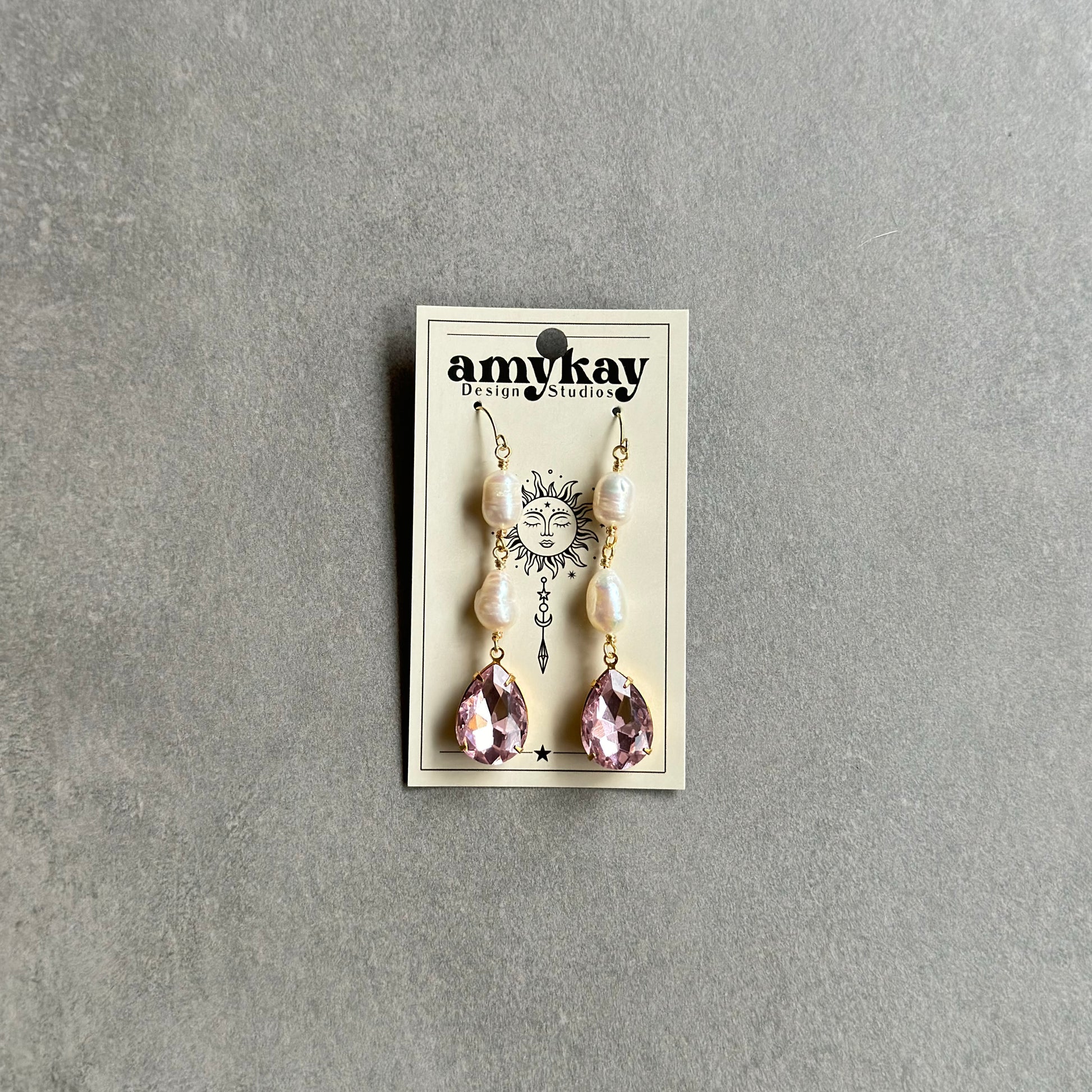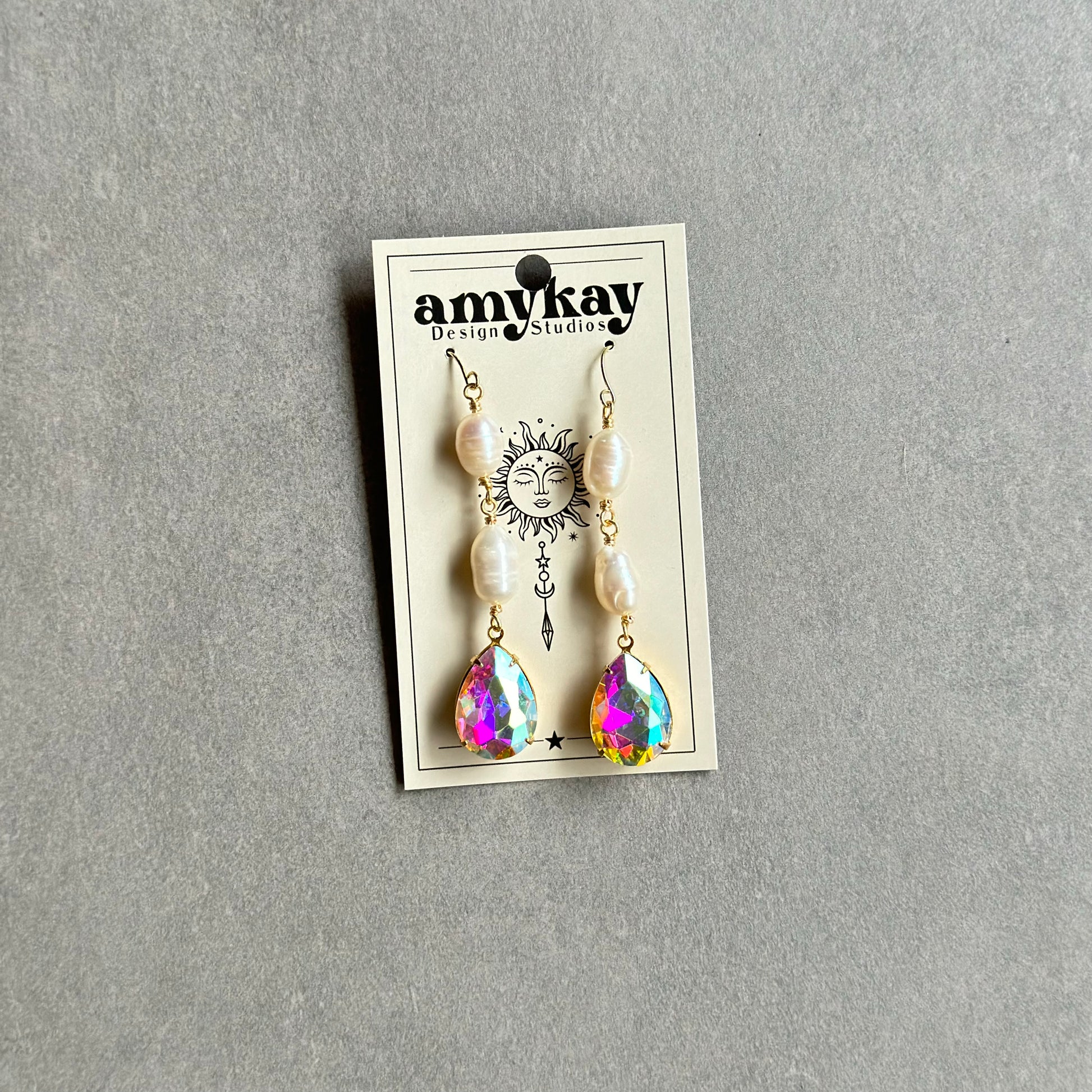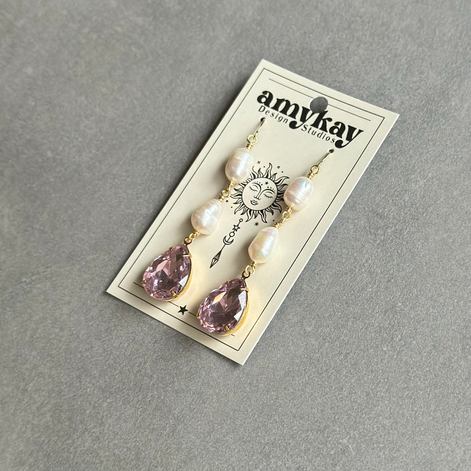 Handmade earrings made with freshwater pearls, vintage pear crystals, and gold plated hooks