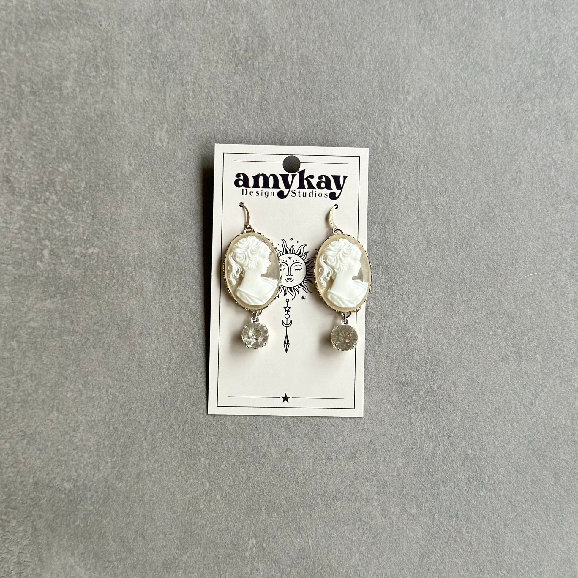 Handmade earrings made with vintage clear cameos in silver plated settings, vintage clear crystals, and sterling silver earring hooks