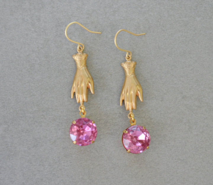 Handmade earrings made with vintage solid brass hands, pink vintage crystals and gold plated earring hooks