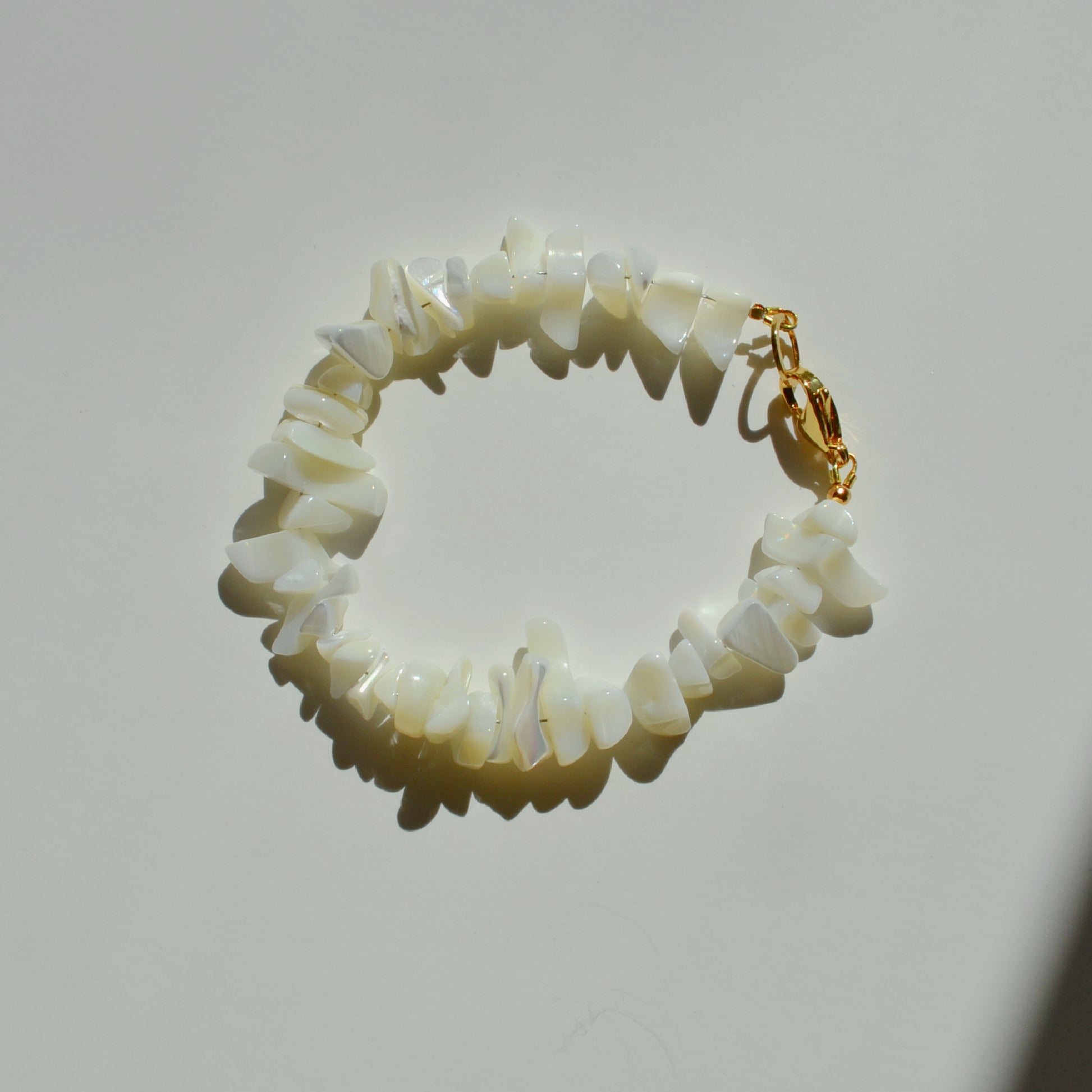 Made with mother of pearl beads and 18k gold plated findings with hypoallergenic, water-resistant, and tarnish-proof clear coating