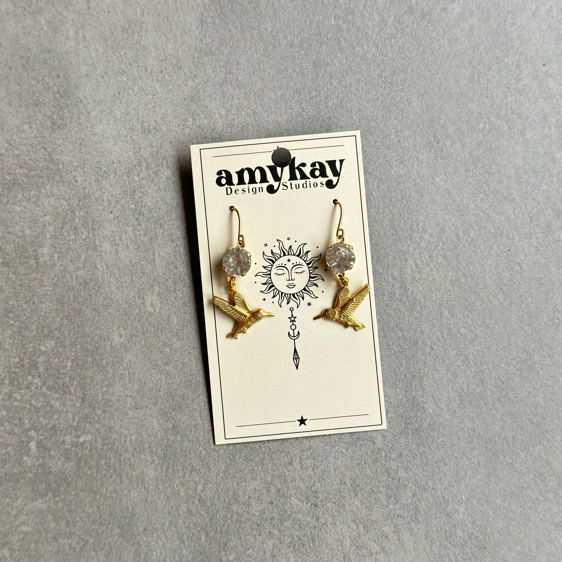 Handmade earrings made with hummingbird charms, vintage clear crystals, and gold plated earring hooks.