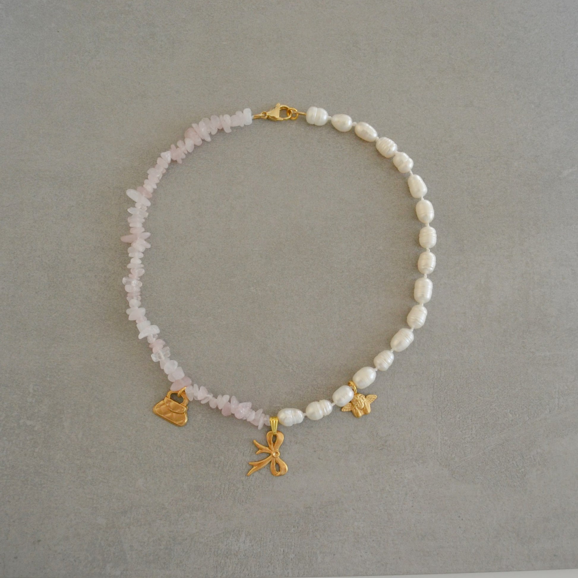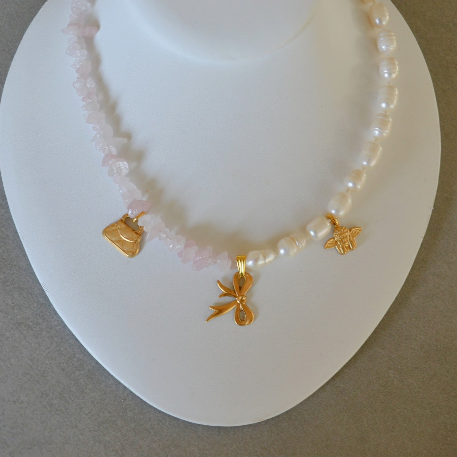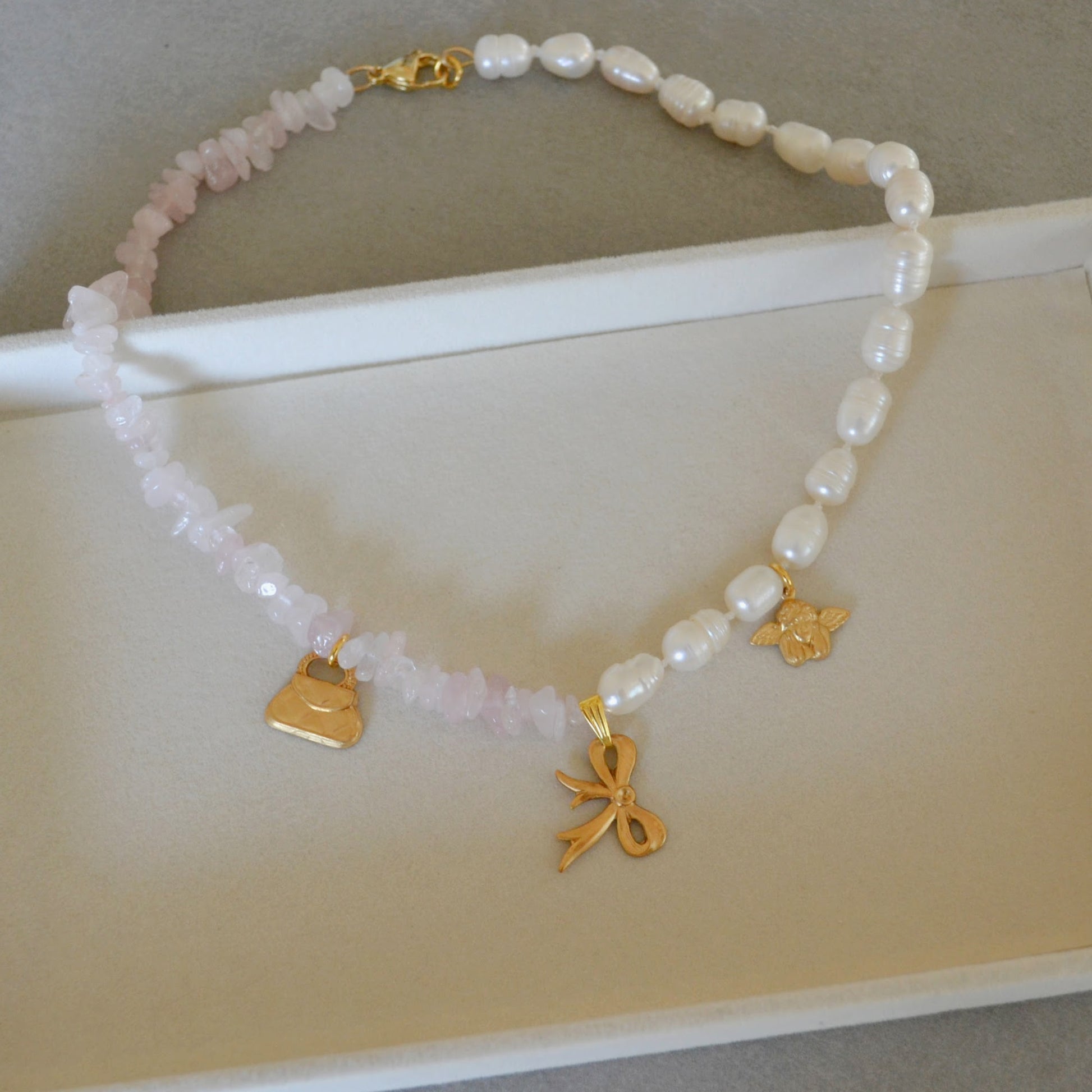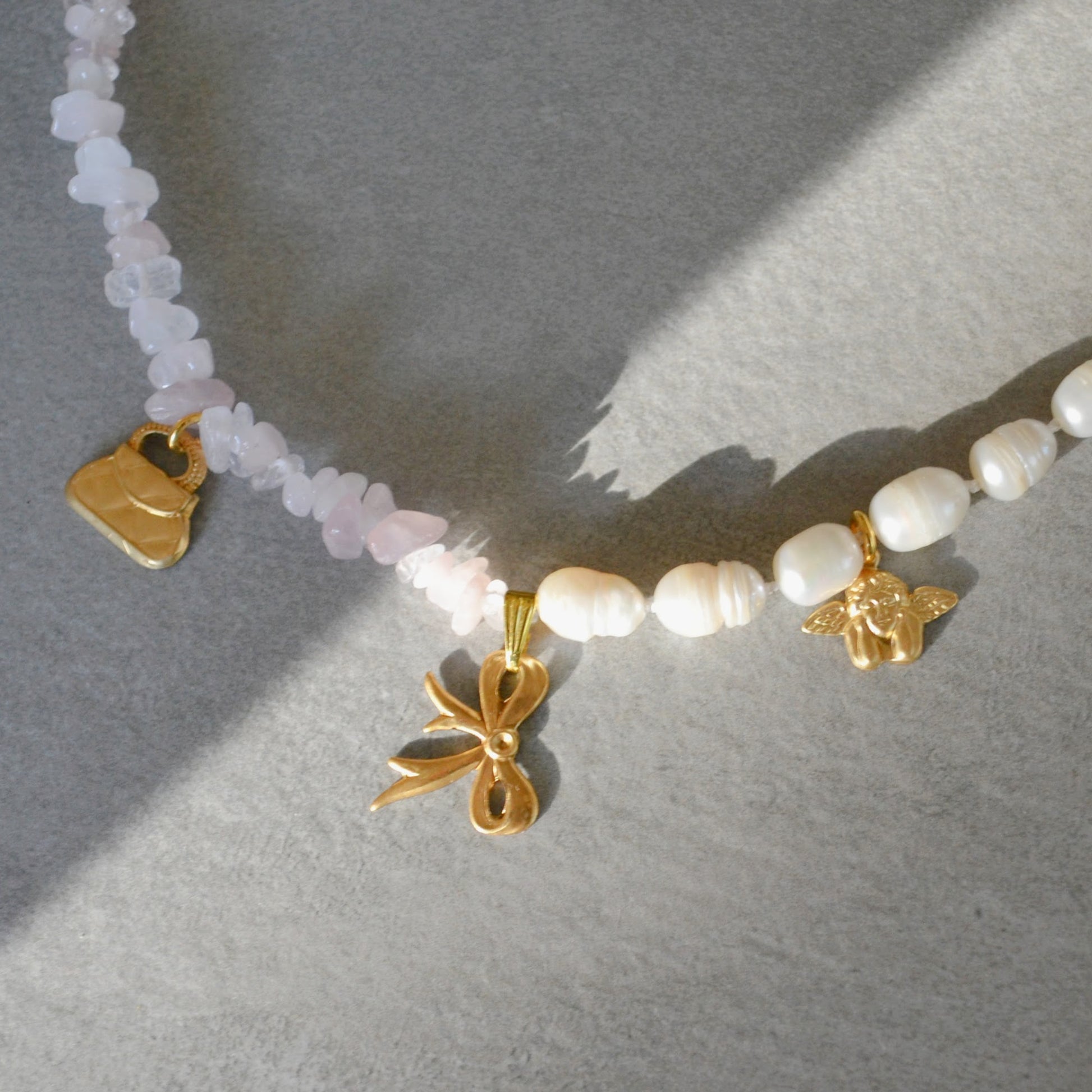 From our "That Girl" collection, each necklace celebrates a different version of that girl—this one is for the Coquette girl. Featuring three vintage charms, freshwater pearls, and rose quartz beads, all hand-knotted onto silk thread, this necklace offers a fresh twist on the timeless string of pearls.The Coquette necklace is for that girl who loves all things girly, pink, and covered in bows.