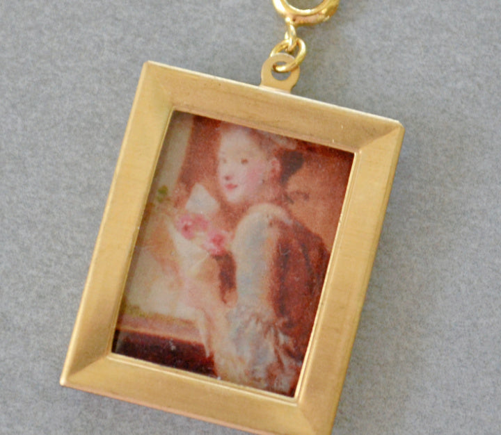 1 brass frame charm with a miniature painting of The Love Letter by Jean Honoré Fragonard
